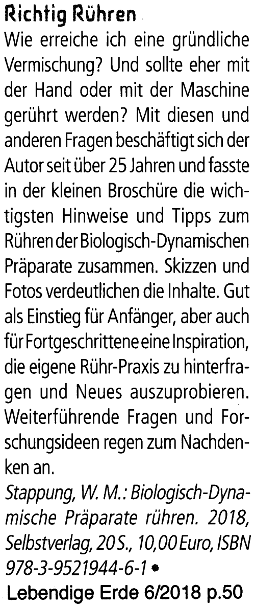 Für das Rühren von Hand, das Rudolf Steiner gegenüber maschinellem Rühren bevorzugt hatte, werden hier theoretische und praktische Grundlagen gegeben. Damit man auch so intensiv rühren kann wie Steiner vorgeschlagen hatte.